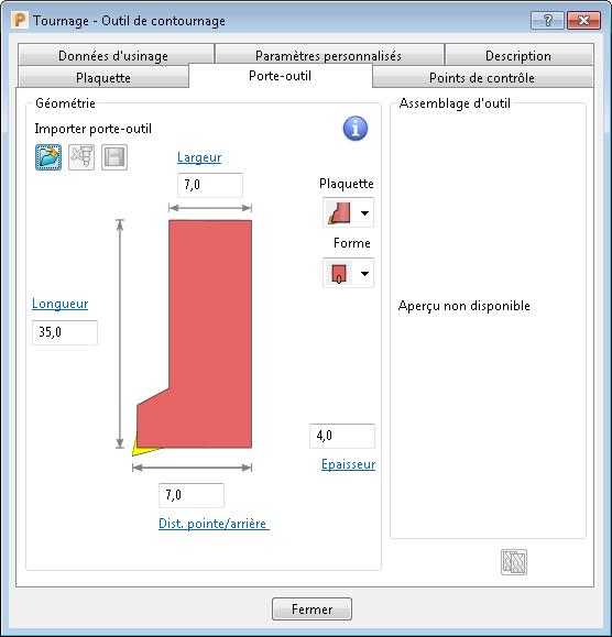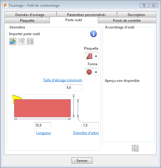 Gauche — La plaquette est située sur le côté gauche du porte-outilForme de porte-outil — Sélectionner une option de la liste pour spécifier la forme du porte-outil.