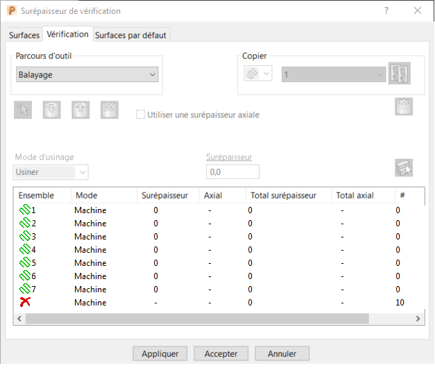 Cette option est similaire à celle de l'onglet Surfaces, sauf que les valeurs appliquées ici sont les valeurs par défaut appliquées à tous les nouveaux parcours d'outils et à toutes les nouvelles frontières. Les parcours d'outils et frontières existants ne sont pas modifiés par les changements faits ici.