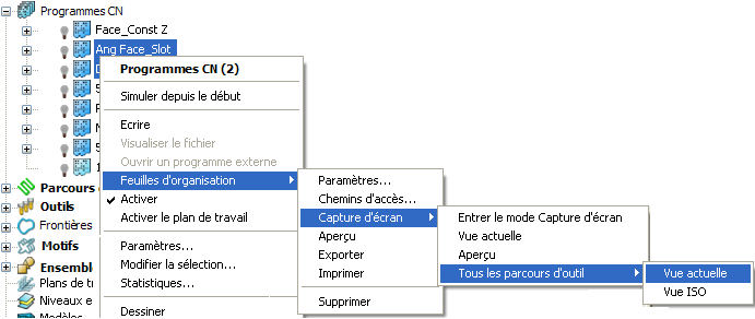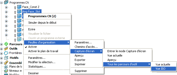 - Dans l'explorateur, sélectionnez tous les noms de programmes CN nécessaires, puis dans le menu contextuel, sélectionnez Feuilles d'organisation > Capture d'écran > Tous les parcours d'outils > Vue ISO.