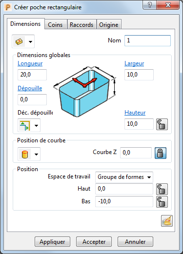 Raccords — Spécifie les propriétés du raccord ou chanfrein d'une feature.