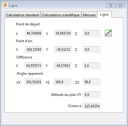 L'onglet Mesurer différence ferme et met à jour le dialogue Ligne avec la distance entre les deux points et les angles apparents.