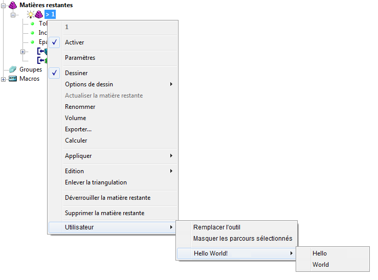 Par exemple, pour créer ce menu Utilisateur et sous-menu intitulé "Hello World!" avec les espaces adéquats :