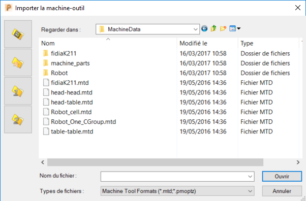 - Déplacer le répertoire MachineData et sélectionner la machine-outil requise, dans ce cas fidiaK211.mtd. La machine-outil aura toujours une extension *.mtd .