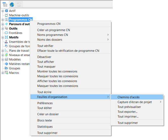- Depuis le menu contextuel Programmes CN, sélectionnez Feuilles d'organisation > Parcours.