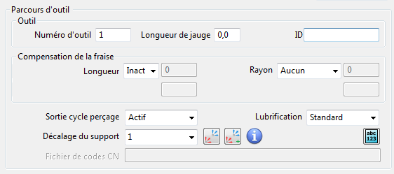 Numéro d'outil — Entrer le numéro d'outil utilisé par le parcours d'outil. Par défaut, c'est la même chose que Numéro d'outil sur l'onglet Pointe de la boite de dialogue Outil. Ceci est ajouté au fichier de coupe.
