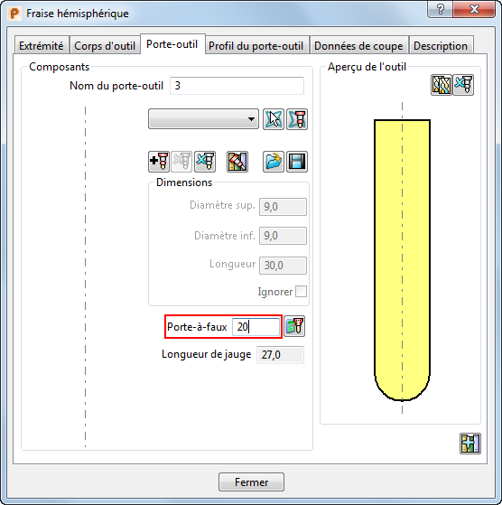 - Entrer une valeur de Porte-à-faux équivalent à la longueur de porte-outil. Cela définit la longueur de l'outil dépassant la face de jauge de la machine. Puis cliquer sur le bouton Fermer. L'outil et le porte-à-faux s'affichent.