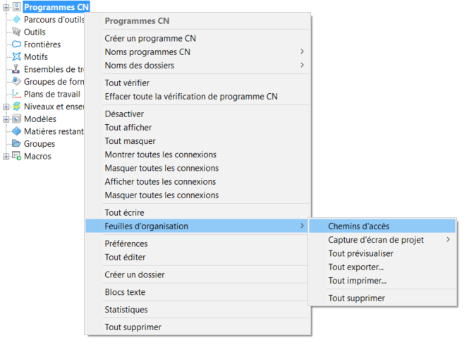 - Depuis un menu contextuel Programmes CN individuel, sélectionnez Feuilles d'organisation > Parcours.