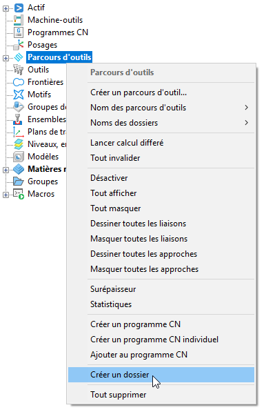 Créer un dossier — Sélectionnez cette option pour créer un dossier nommé Dossier1. Vous pouvez renommer ce dossier de manière habituelle, puis faire glisser les entités du type particulier dans le dossier (par exemple, les parcours d'outils dans un dossier de parcours d'outils).