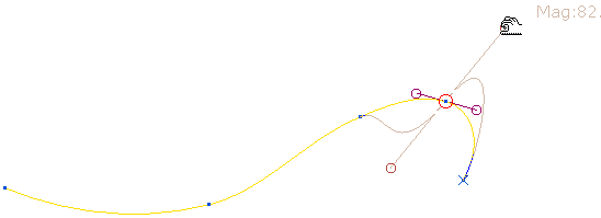 - Sélectionner un point sur la courbe pour l'éditer. La courbe est en jaune, a une poignée rouge au point sélectionné et deux lignes rouge mat avec des cercles sur leur extrémité, indiquant la direction de tangence et l'amplitude.