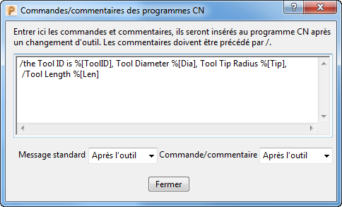 Vous pouvez également utiliser les variables dans la zone Commentaires de programme CN (accessible en cliquant sur le bouton Commentaires sur l'onglet Parcours d'outil sous Préférences CN):