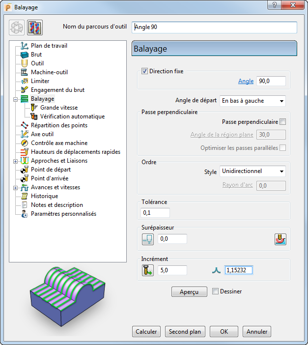 Dans le cas d'un parcours de finition en balayage, le dialogue Finition en balayage: