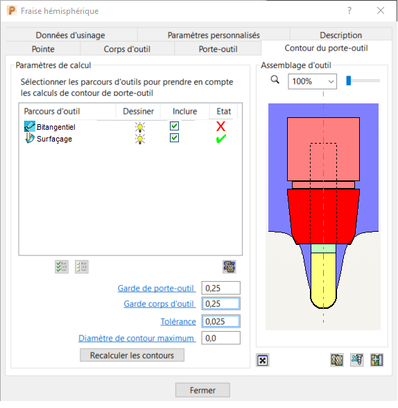 - Cliquez sur Recalculer les contours pour calculer le contour du porte-outil et déterminer si le porte-outil entre en collision avec le modèle.