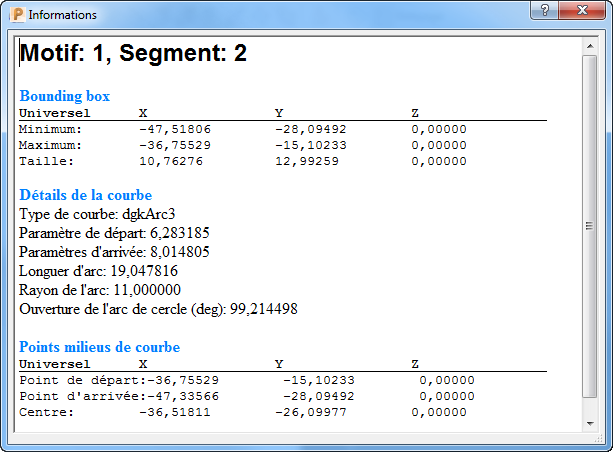 - Propriétés — Sélectionner pour afficher les extensions, le type et les points-clés de l'arc.