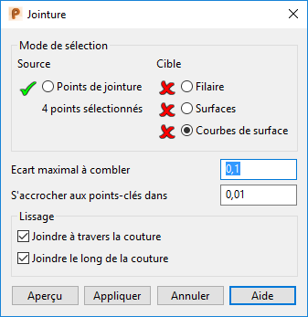 - Cliquez sur Outils de surface > Modifier > Editer courbes > Coudre pour afficher la boite de dialogue Jointure :