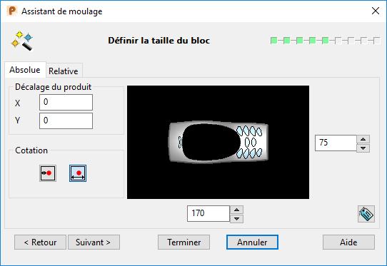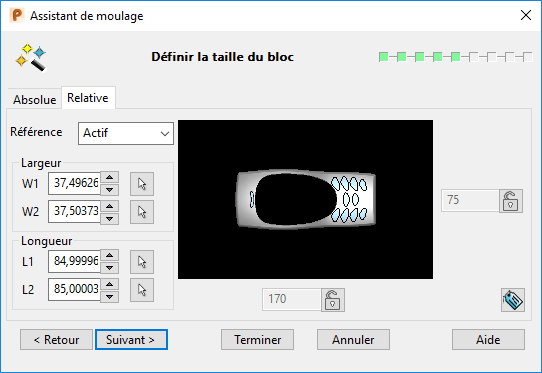 Un bloc est automatiquement créé autour de l'élément sélectionné, sauf si vous entrez dans l'assistant de moulage avec un bloc déjà défini. La taille du bloc peut être spécifiée en utilisant soit des valeurs absolues, soit des valeurs relatives. L'assistant contient une image ombrée de la pièce et filaire du bloc. Vous pouvez également faire pivoter, zoomer et déplacer cette image en utilisant la souris.