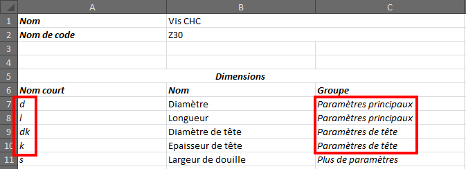 - Paramètres principaux dans les cellules de groupe pour d et l