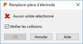 Si vous ne désactivez pas l'option Vérifier les collisions, la boîte de dialogue Collisions d'électrode s'affiche. Sélectionnez OK pour fermer la boite de dialogue et remplacer la pièce.