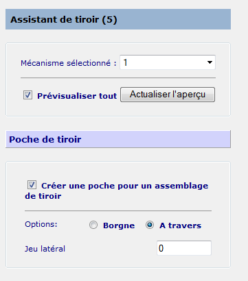 Créer une poche pour l'assemblage de tiroir — Sélectionnez cette option pour afficher un volet d'options. Désélectionnez cette option pour supprimer les options.