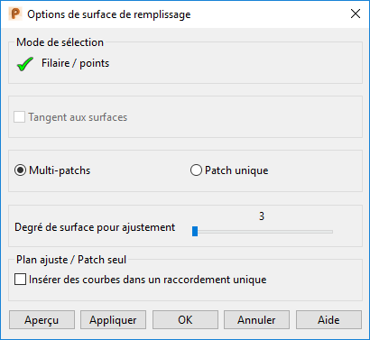 Pour spécifier les options de création avancées quand vous créez une surface en utilisant l'option Remplissage, cliquez sur Avancé dans la boite de dialogue du surfaceur intelligent pour afficher la boite de dialogue Options de surface de remplissage.