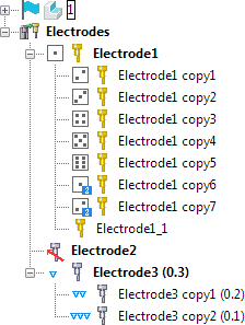 Toutes les électrodes d'un modèle sont contenues dans la catégorie Electrodes. Cliquez sur le bouton Développer pour ouvrir la catégorie et afficher toutes les électrodes contenues.