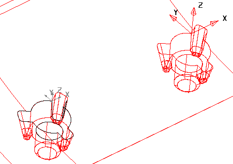 Si la copie de l'électrode n'entre pas en collision avec la pièce, elle est créée dans la bonne position et rotation pour chacun des plans de travail de destination. En filaire, les copies sont ombrées en gris.