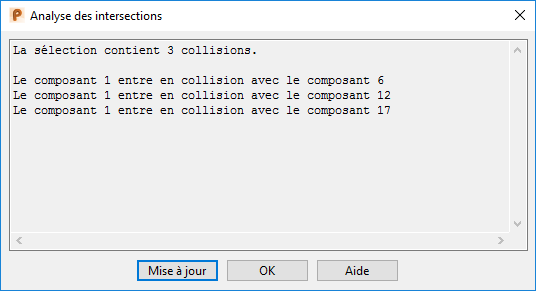 Cette boite de dialogue rapporte toutes les collisions entre les composants sélectionnés.