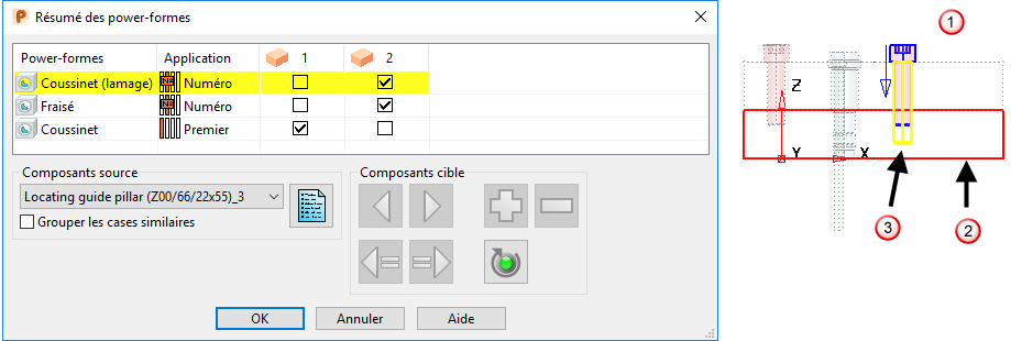 Vous pouvez cliquer sur une rangée sur l'en-tête de la colonne dans la boite de dialogue Résumé des power-formes pour mettre en évidence l'élément correspondant dans le modèle. Le curseur change quand il est positionné sur un élément qui peut être mis en évidence.