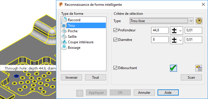 - Cliquez sur Solide > Forme > Reconnaissance intelligente pour afficher la boite de dialogue Reconnaissance de forme intelligente.