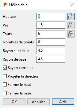 Quand une dimension est verrouillée, elle ne change pas quand vous changez une autre dimension. Par exemple, si la hauteur est verrouillée et que vous changez le pas, le nombre de tours change pour conserver la cohérence de la définition.