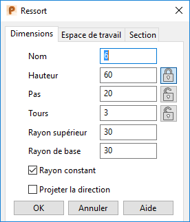 - Cliquez sur les onglets pour spécifier les dimensions, l'espace de travail et les détails de section du ressort.