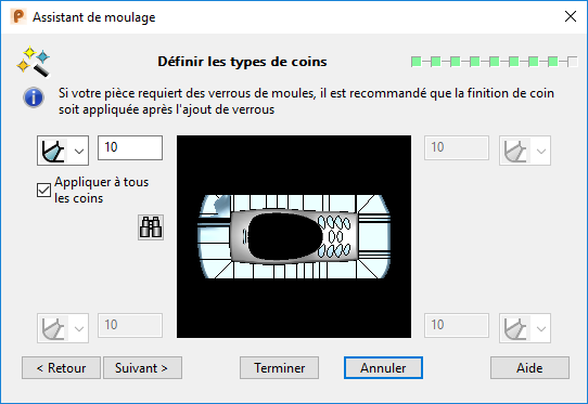 La page Définir les types de coins vous permet de spécifier le type de coin pour chaque coin du bloc de moulage.