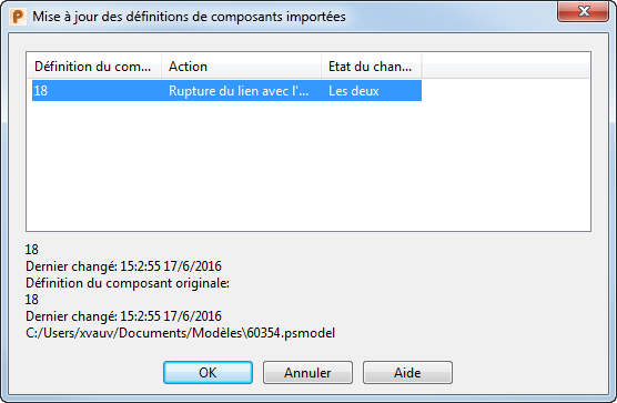 Utilisez cette boite de dialogue pour mettre à jour les définitions de composant importées, comme ceci :
