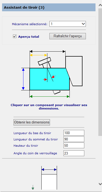 Cette page vous permet de définir les dimensions de base des trois composants principaux du tiroir.