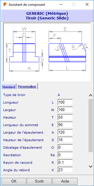 Les valeurs que vous avez entré dans l'assistant apparaissent dans cette boite de dialogue. Cette boite de dialogue vous permet d'éditer de petites dimensions (tels que les rayons et les chanfreins) pour le composant.