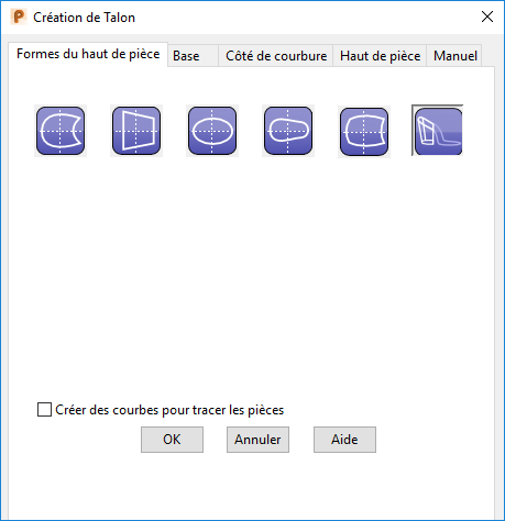 Utilisez l'onglet Formes de haut de pièce pour éditer les formes du haut de pièce de talon. Cette option est disponible uniquement quand vous travaillez avec une surface de référence.