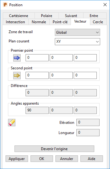 Quand vous cliquez sur OK ou Appliquer, une nouvelle position est entrée en allant le long du vecteur depuis la position de départ.
