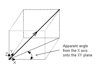 Angles apparents — L'angle apparent est mesuré entre la projection du vecteur sur un plan et sur l'axe sélectionné. Si l'axe est X, le plan est XY. Pour Y, le plan est YZ et pour Z, c'est ZX. Un exemple est montré ci-dessous de l'angle apparent pour l'axe X :