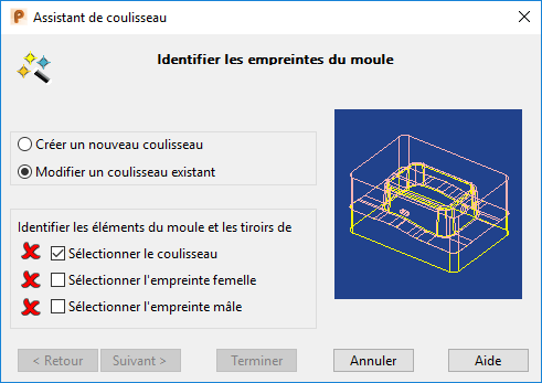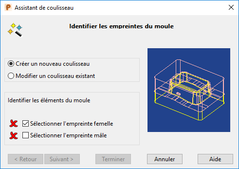 Utilisez cette page pour sélectionner les empreintes de moulage pour les plaques de moule et de contre-moule, en utilisant les options suivantes :