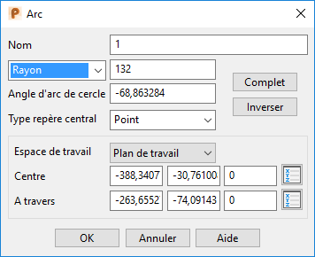 Utilisez cette boite de dialogue pour éditer les arcs. Si vous éditez un arc de raccord, le résultat de la modification affecte les deux lignes.