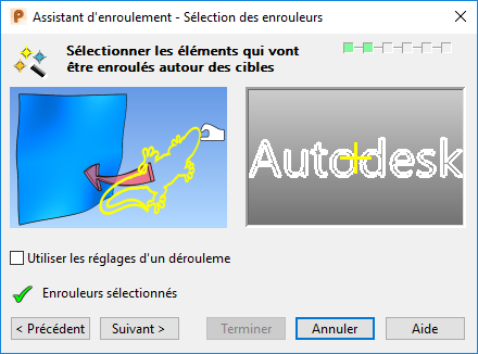 Enrouleurs sélectionnés — Sélectionnez le filaire à enrouler sur la surface cible. L'icône passe de