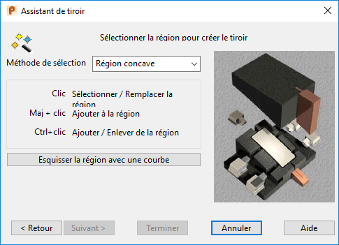 La méthode d'esquisse d'une région est destiné à être utilisée quand la sélection automatique échoue parce que le solide est mal lié ou que la région est trop complexe. La méthode d'esquisse d'une région prend plus de temps à calculer la région en contre-dépouille, essayez donc d'abord la méthode de sélection, autant que possible sur la page Options de distance d'extension.