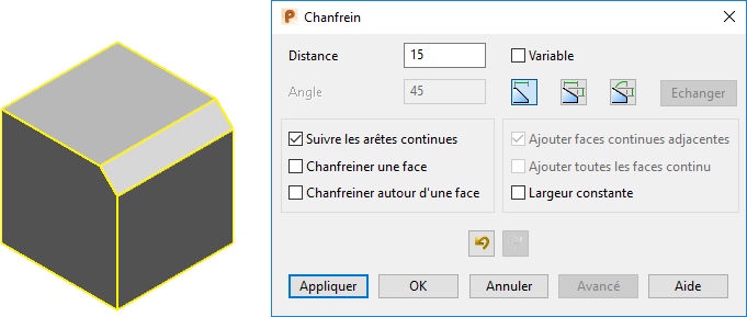 Cliquez sur dans la boite de dialogue Chanfrein.