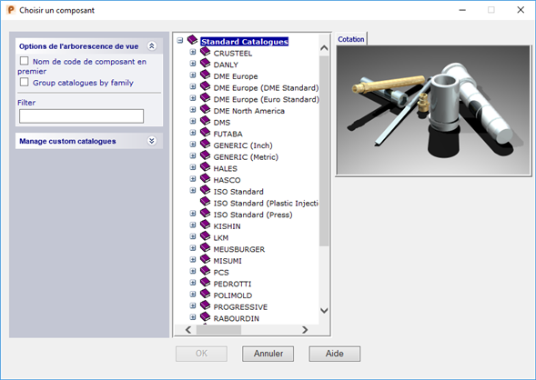 — Sélectionnez un catalogue pour afficher la liste des composants. Sélectionnez le composant que vous voulez créer. 1 L'image du composant est affichée dans la boite de dialogue :