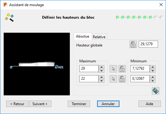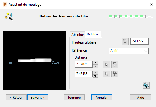 L'épaisseur minimum des empreintes est automatiquement calculée et les valeurs sont affichées dans l'assistant, mais vous pouvez également définir la hauteur du bloc en utilisant cette option. La valeur du dessus représente la hauteur minimum du moule. La valeur du dessous est la hauteur minimum de la matrice.