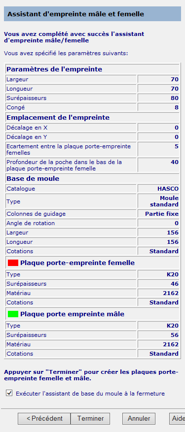 Utilisez cette page pour vérifier vos paramètres, puis créer les plaques de moule et de contre-moule.