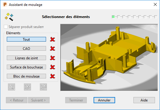 Si vous choisissez des éléments avant de lancer l'assistant, ils sont automatiquement classifiés dans des catégories. Vous pouvez alors changer cette classification. Vous pouvez utiliser Ctrl+A pour sélectionner tous les éléments qui correspondent avec la sélection d'éléments sur la page Assistant de moulage étape 1 - Sélectionner des éléments. Pour utiliser cet élément, vous devez rendre l'arrière-plan actif en cliquant sur la fenêtre en dehors de l'assistant.