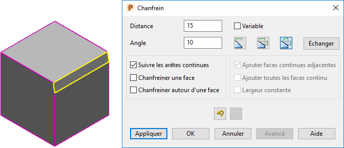 dans la boite de dialogue Chanfrein.