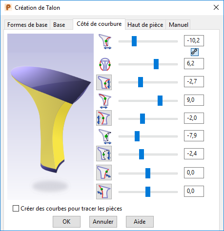 Utilisez l'onglet Courbure latérale pour spécifier les paramètres à utiliser quand vous créez le côté du talon (affiché en jaune dans le schéma).