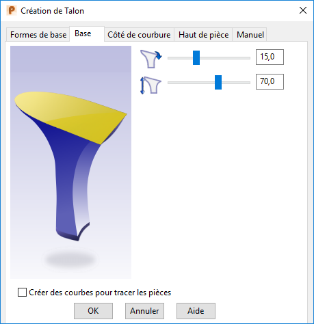 Créer des courbes pour tracer les pièces — Sélectionnez cette option pour créer des courbes le long des arêtes du talon. Utilisez ces courbes pour créer des pièces sur le talon, tel qu'un protège-talon ou un effet de talon Louis sur l'avant du talon.