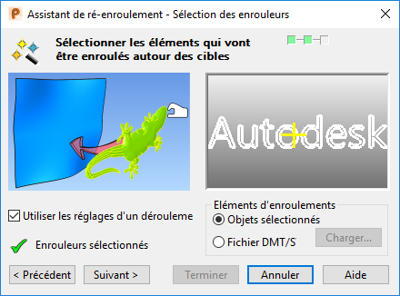 Une surface qui a été déroulée est automatiquement reconnue quand vous démarrez l'assistant d'enroulement. L'assistant d'enroulement devient l'assistant de ré-enroulement et vous guide à travers le ré-enroulement de l'élément sur l'élément cible :